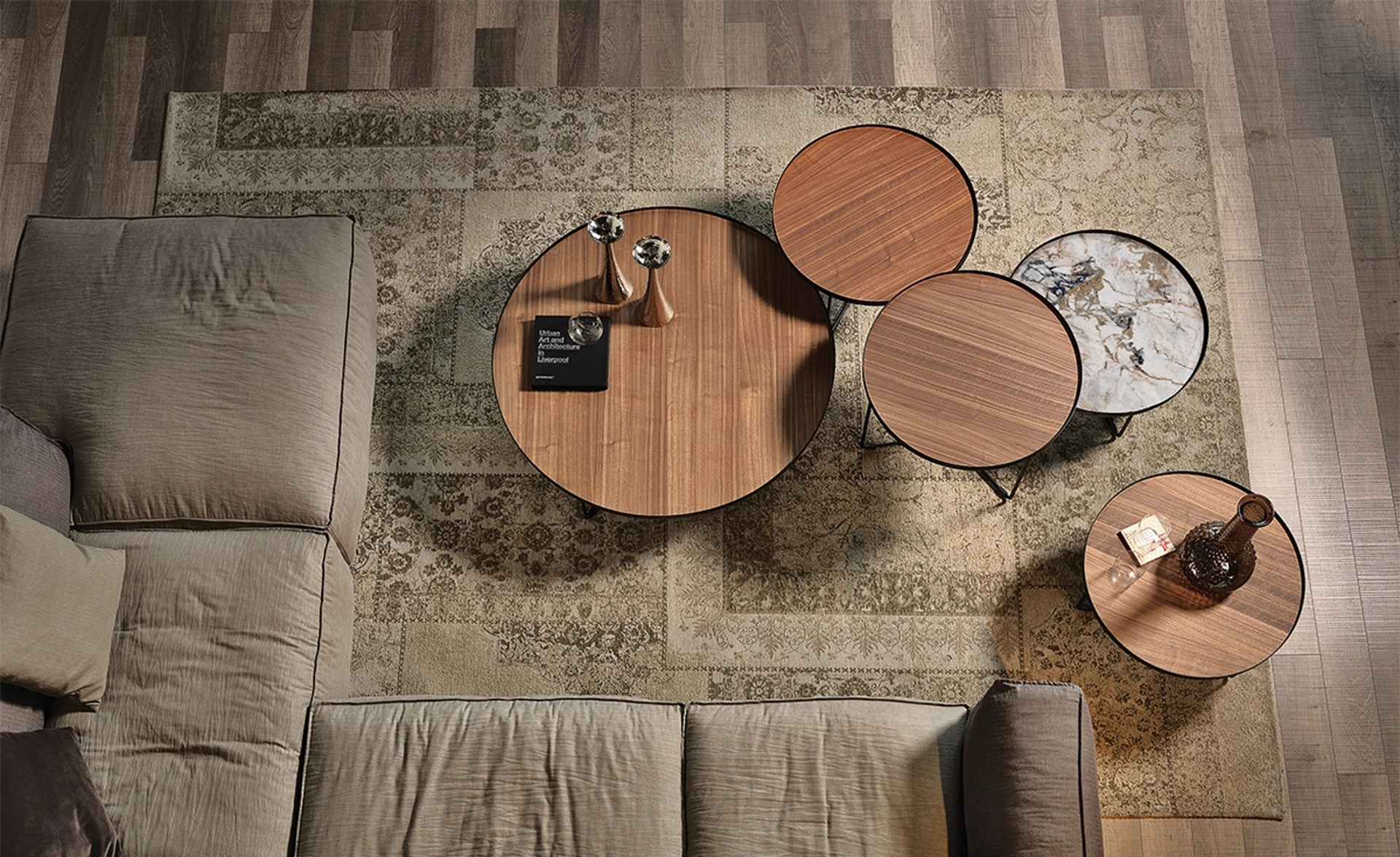 | Materiali: | Piano in legno (noce Canaletto, rovere bruciato, rovere naturale), base in acciaio laccato (nero, titanio, bronzo) con cornice in bronzo spazzolato. |