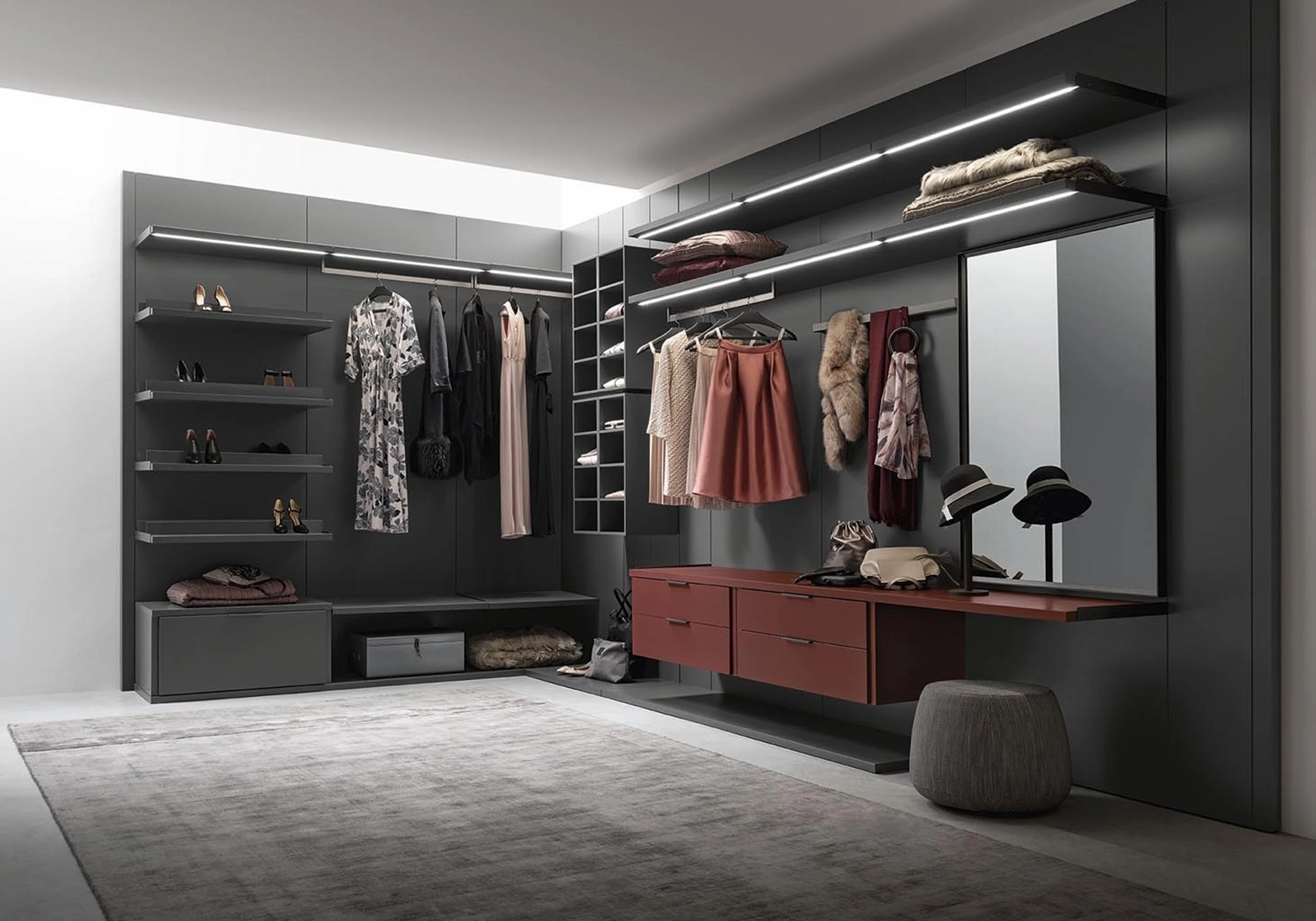 Quali accessori e soluzioni interne sono previste per la Cabina Armadio Store?L'interno della cabina armadio può essere attrezzato con ripiani, cassetti, tubi appendiabiti e illuminazione integrata, per una organizzazione ottimale e funzionale.