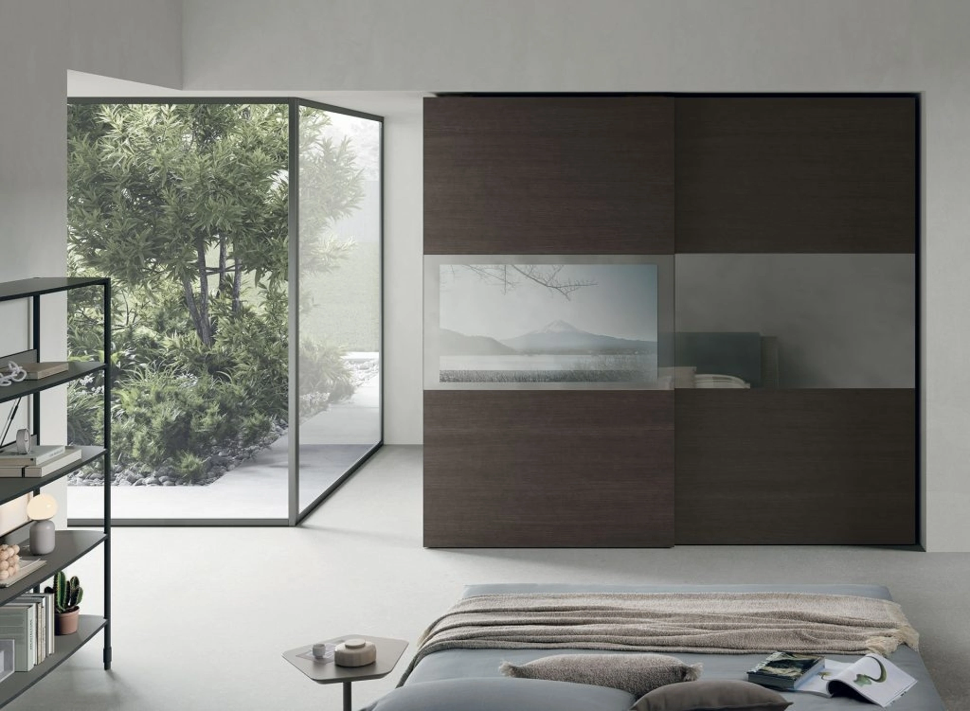 | Materiali e Finiture: | Ante scorrevoli e struttura in materico rovere moka o materico opaco marna; inserto centrale in vetro Stopsol; profilo e maniglia integrata in metallo antracite 160 o metallo marna 180. |