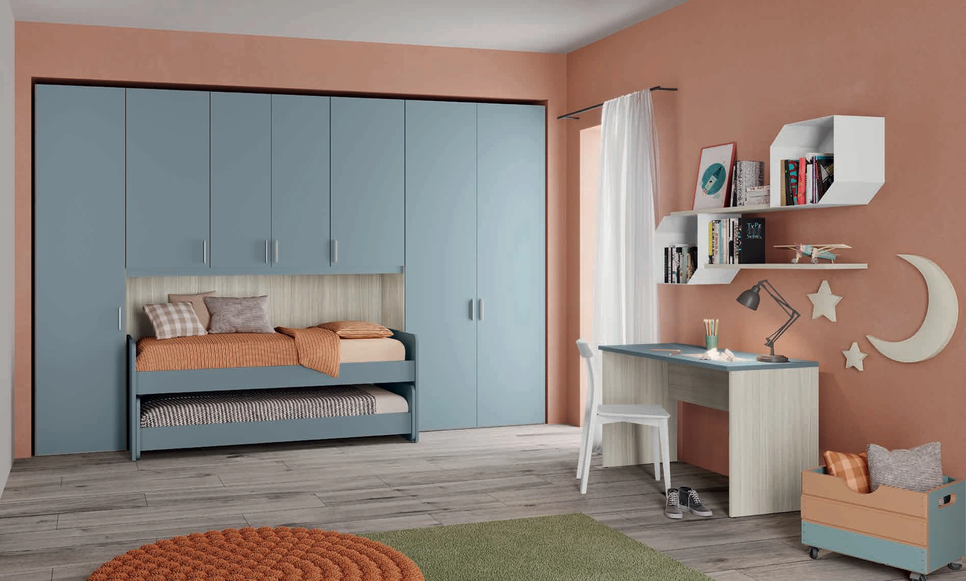 Colombini Casa offre una ricca gamma di accessori da comporre su misura: troverai letto, armadio o cabina armadio, tavolo da lavoro, sedie e librerie. Nella progettazione della stanza dei bambini affidati a noi: nel nostro showroom presentiamo tutte le più esclusive composizioni arredative moderne per la loro camera. Porta valore estetico e colori vivaci nella stanza dedicata ai bambini con questa soluzione, una delle Camerette a ponte per bambini di Colombini Casa. Se cerchi spunti creativi per arredare perfettamente la stanza dei tuoi bambini, ti presentiamo la Cameretta Volo Kids C028 di Colombini Casa con finitura in melaminico.