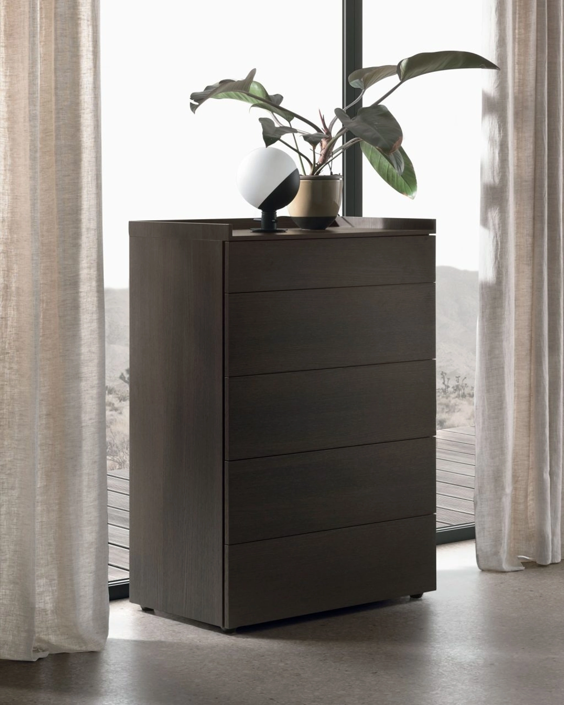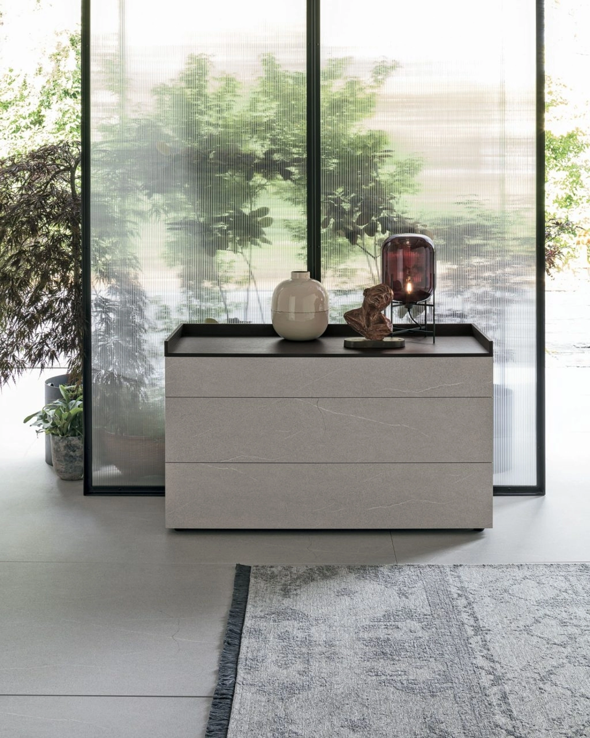 Il Sir Gruppo Notte di Tomasella si configura come un mobile contenitore per l'ambiente riposo, caratterizzato da linee pulite ed essenziali e un piano superiore con bordo rialzato. Questo elemento, più che un dettaglio estetico, offre una superficie funzionale, con la possibilità di essere un'ampia gamma di personalizzazioni cromatiche e materiche per integrarsi in ogni contesto. La versione a doppio vano contenitore è disponibile in molteplici opzioni di rivestimento materico, tra cui la distintiva finitura in rovere carbone per corpo e piano vassoio, conferendo all'ambiente un'equilibrio tra eleganza visiva e praticità d'uso. La sua concezione strutturale è studiata per assicurare robustezza e longevità, riflettendo standard qualitativi elevati.
