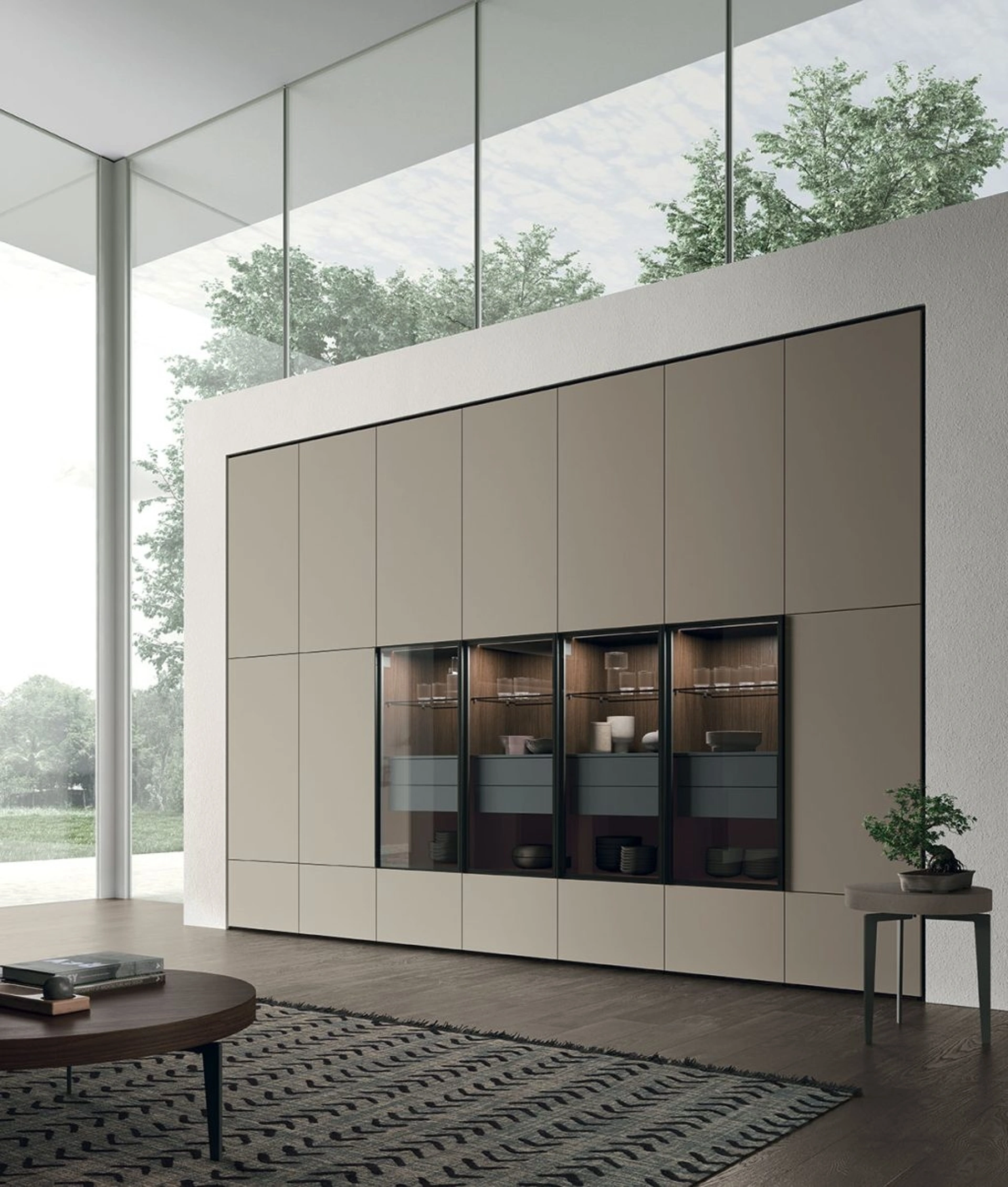 | Materiale: | Struttura in materico rovere moka, Ante in materico arena, Cassetti laccati opaco bromo 176, Ante centrali Metropolis con telaio in metallo antracite e vetro trasparente 320 |
