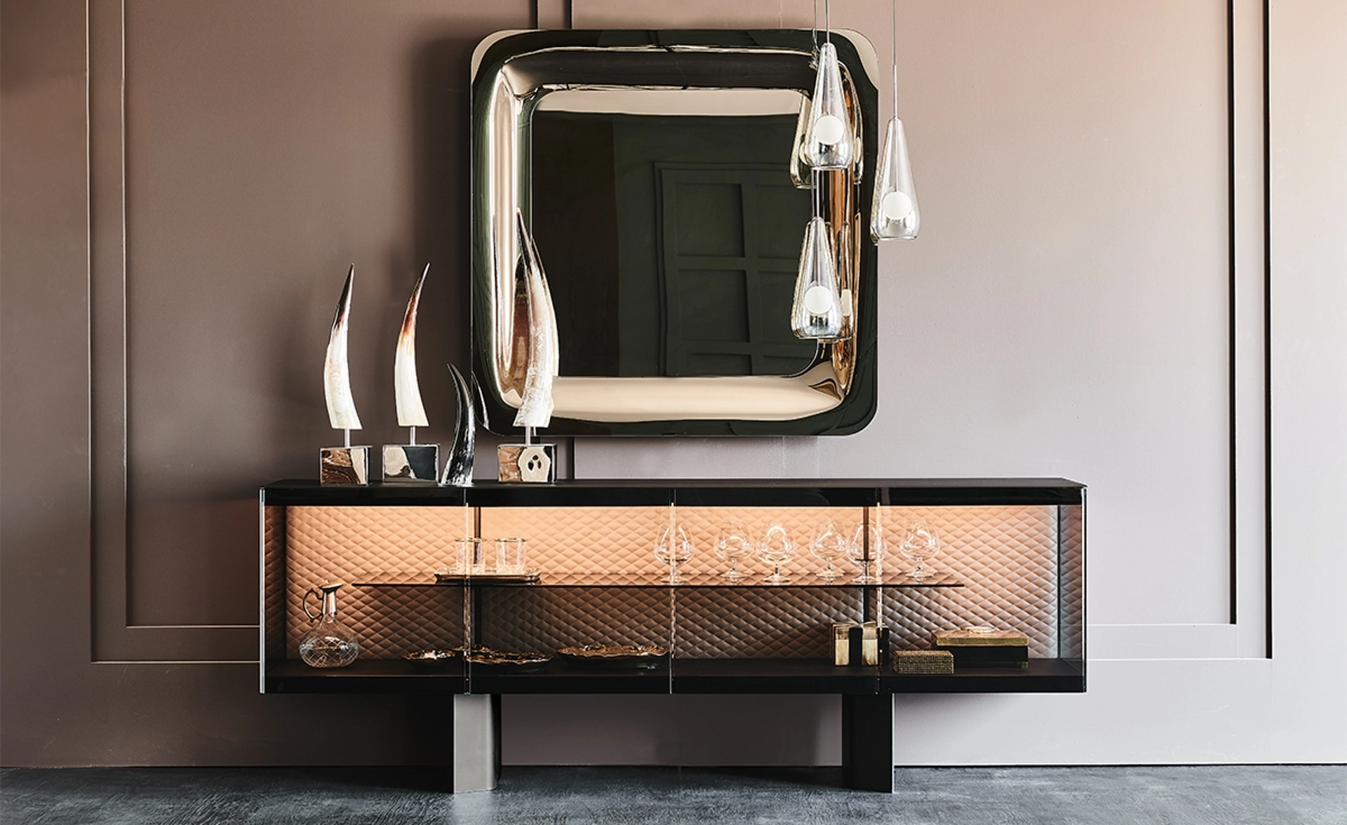 | Materiale: | Acciaio verniciato goffrato nero (GFM73), Cristallo fumè, Cristallo verniciato nero, Ecopelle o pelle trapuntata, Cristallo verniciato nero acidato |