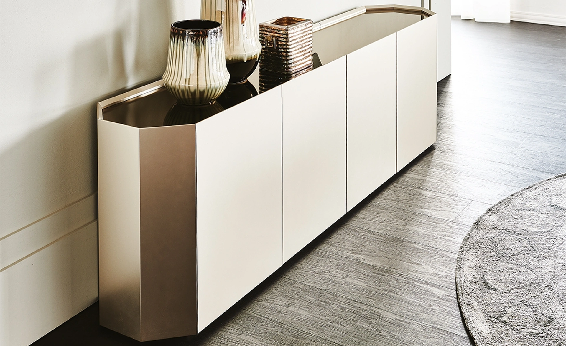 La madia Madia Chelsea di Cattelan Italia, frutto della creatività di Alessio Bassan, si configura come un mobile contenitore di alto profilo per la zona living. Il suo design distintivo, che evoca forme scultoree e geometriche, le permette di integrarsi con naturalezza in ambienti sia residenziali che contract. Questa credenza, dal carattere minimalista, è valorizzata da dettagli curati e finiture esclusive, tra cui spiccano il top in cristallo specchiato bronzo e i ripiani interni in cristallo trasparente. Le varianti della serie 'B' sono equipaggiate con una base in acciaio, disponibile nelle finiture cromato o verniciato graphite. Diverse configurazioni dimensionali sono offerte per massimizzare l'adattabilità a ogni spazio. La qualità costruttiva è supportata da un'attenta selezione dei materiali e dalla possibilità di reperire componenti specifici per la manutenzione.