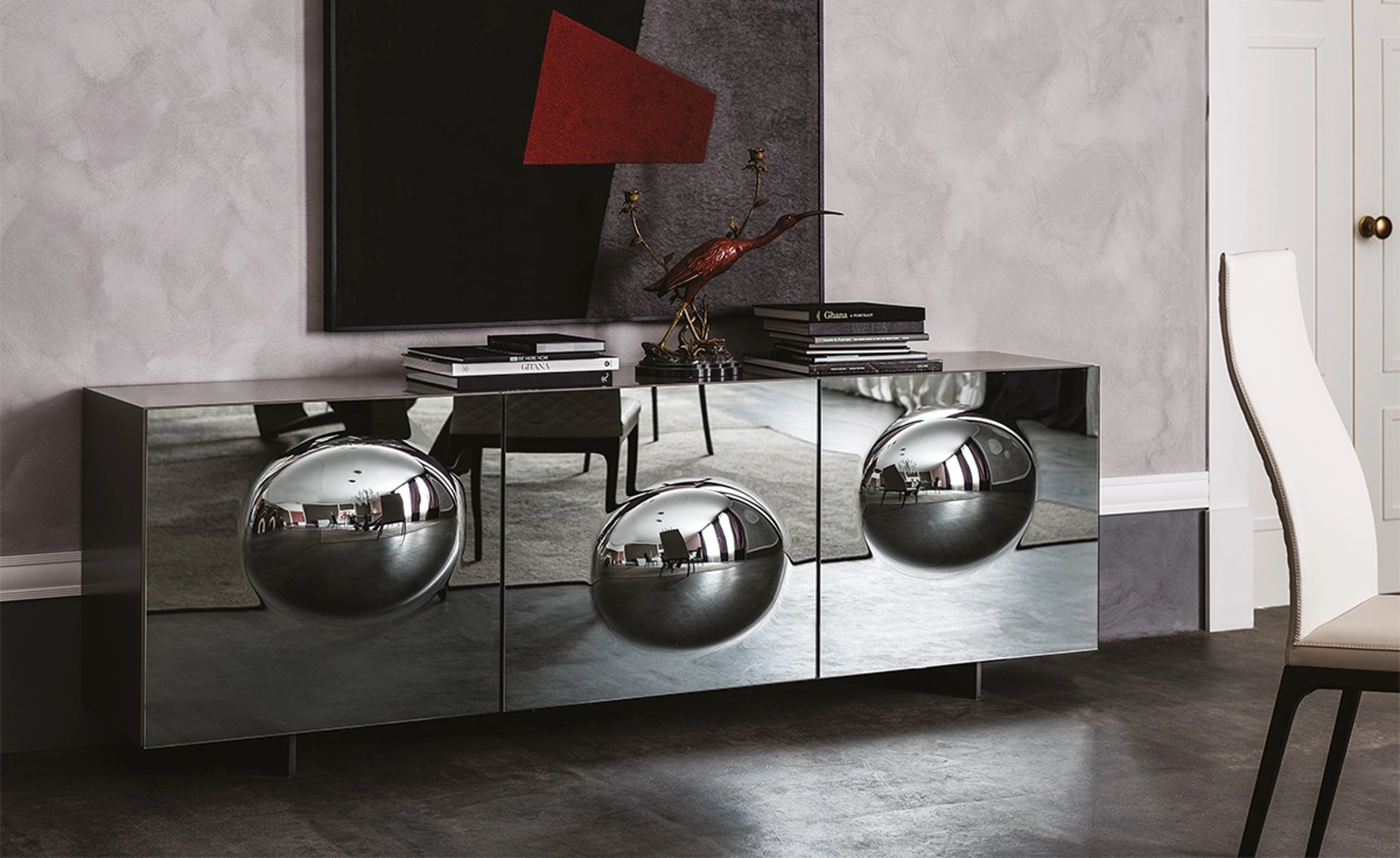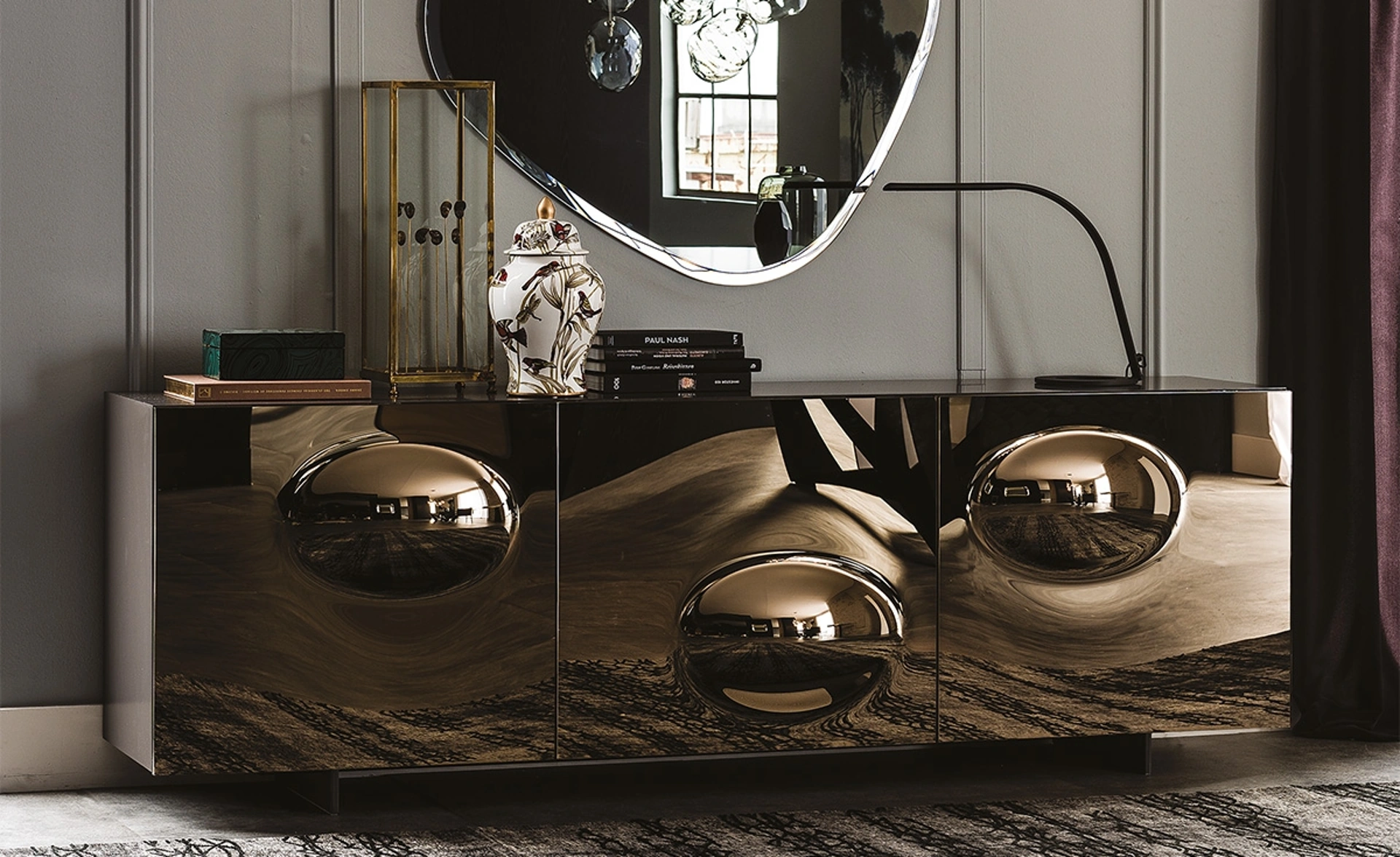 | Materiale: | Cristallo bombato (ante), Legno laccato moka lucido (struttura, opzionale), Legno laccato graphite opaco (struttura, opzionale), Legno laccato titanio (struttura, opzionale) |