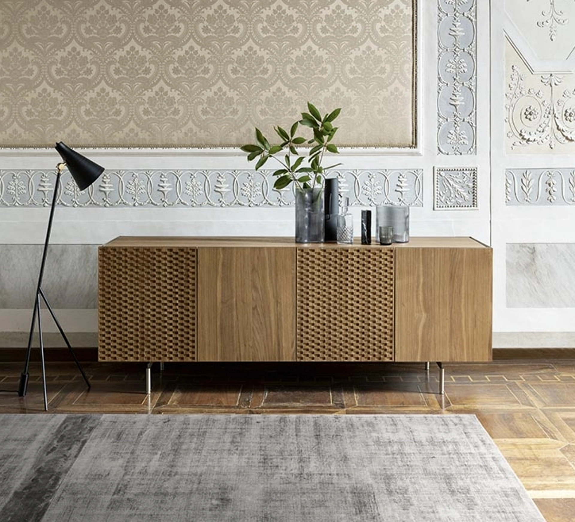 La madia Dama di Alf Da Frè è personalizzabile nei materiali o nelle finiture?Sì, Visone Casa S.r.l. offre la possibilità di personalizzare le dimensioni standard degli arredi. Puoi visionare i campioni di materiali, finiture e rivestimenti nella nostra materioteca dedicata alla progettazione.