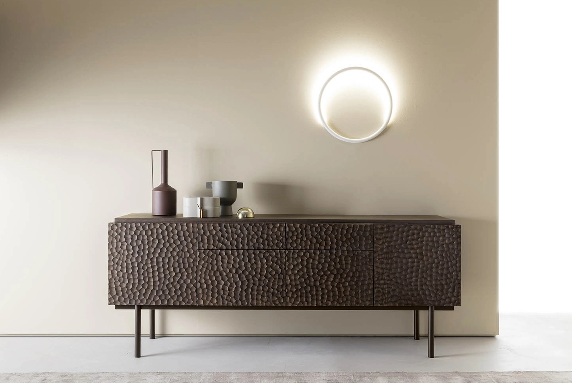 Esplora la Madia Gubia di Alf Da Frè, ora disponibile nel nostro showroom Visone Casa S.r.l. ad Alife. Con un design innovativo e soluzioni su misura per il tuo progetto d'arredo, ti invitiamo a toccare con mano la qualità. Questa madia si distingue per i suoi volumi geometrici scolpiti, un tributo all'artigianalità italiana. La struttura in Fashion Wood Rovere Terra conferisce un'eleganza naturale, mentre la base in metallo verniciato Elettrocol con finitura raggrinzante non solo aggiunge un tocco materico unico ma garantisce anche robustezza e durata. Progettata da Gordon Guillaumier, offre versatilità con la possibilità di retro rifinito e curati interni dei cassetti con tappetino in ecopelle, assicurando una soluzione funzionale ed esteticamente impeccabile per ogni ambiente.