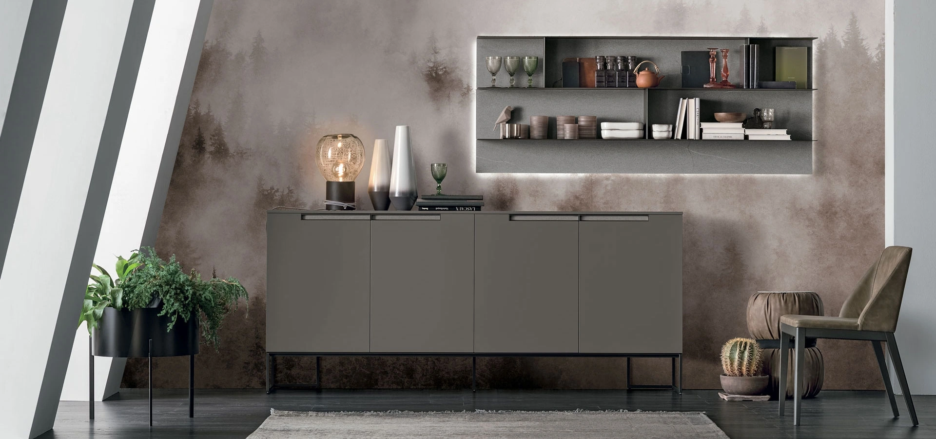 La madia Madia Regolo R10 di Tomasella, espressione di un design contemporaneo e ricercato, integra una maniglia con inserto personalizzabile, elemento distintivo della collezione Regolo. Questo arredo, funzionale e altamente decorativo, è concepito per generare dinamismo visivo e geometrico, superando la tradizionale staticità delle forme. La versione R10 si caratterizza per la finitura laccato opaco smoke 128, l'elegante inserto materico piasentina chiara e un robusto basamento in metallo antracite 160, che ne esaltano la struttura e la durabilità. L'attenta selezione e la combinazione di materiali di alta qualità sono fondamentali per garantire prestazioni estetiche e funzionali di lunga durata.