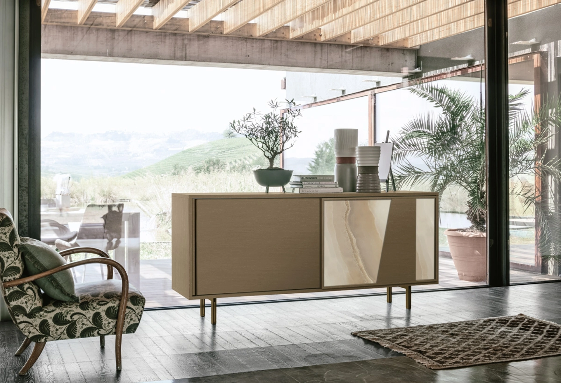 La Madia Modus New di Target Point si distingue per il suo design contemporaneo e la funzionalità avanzata, integrando due ante scorrevoli che ottimizzano lo spazio. La robusta struttura in laminato è proposta in diverse texture, tra cui effetti legno come castoro, deserto, rustico, rustico bianco e perla, oltre a finiture spazzolate. Le ante offrono la possibilità di raffinati inserti in gres porcellanato, che replicano marmi pregiati come Carrara, Amani, Arabescato ed Emperador, o alternative in specchio e vetro ondulato. Questo mobile, ideale per ambienti living e sale da pranzo, è progettato per massima capienza e disponibilità con basamento in laminato o eleganti piedini metallici da 20 o 25 cm. L'attenta selezione dei materiali e delle finiture garantisce durabilità e un'estetica raffinata, consentendo un'ampia personalizzazione.