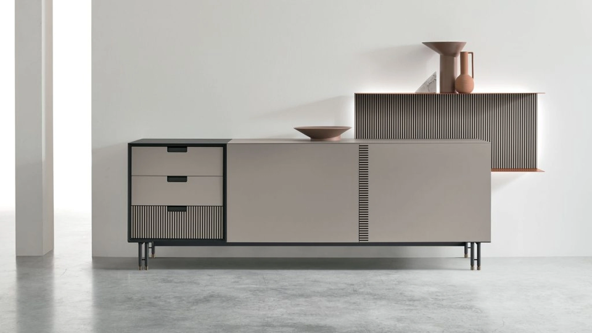 Presentiamo la Madia Time A di Tomasella, un'espressione di design contemporaneo e ingegneria funzionale, integrata nella rinomata collezione Madia Time. Questa unità si distingue per le sue finiture ricercate in CDF arena canettè, CDF arena e CDF nero, arricchite da una sofisticata boiserie in CDF laccato opaco nella tonalità tabasco 171. La struttura è saldamente supportata da un basamento in metallo antracite 160. Con le sue proporzioni studiate, questa madia non solo arreda con eleganza il living ma offre anche una notevole capacità contenitiva, coniugando estetica e praticità in un unico complemento d'arredo. La nostra esperienza è a disposizione per supportare la scelta della configurazione e delle finiture ideali, garantendo l'integrazione perfetta nel vostro ambiente.