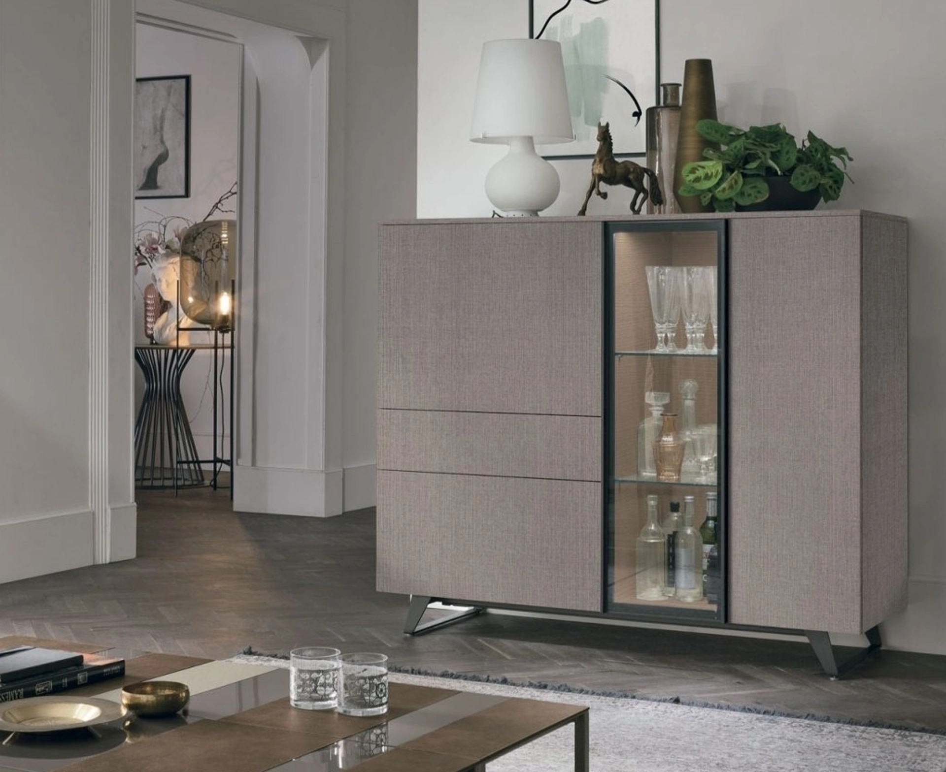 La madia Metropolis C01 di Tomasella rappresenta una soluzione d'arredo dal design distintivo e dalla notevole versatilità. La sua struttura è realizzata con finiture di pregio in materico alpaca e rovere sabbia, completata da un top in materico alpaca e un robusto basamento in metallo antracite 160. La configurazione C01 integra un'elegante anta in vetro, armonizzabile con le diverse opzioni estetiche disponibili. Questo sistema modulare offre ampie possibilità di personalizzazione, riflettendo l'ingegneria e la qualità tipiche dei marchi di eccellenza nel settore dell'arredamento.