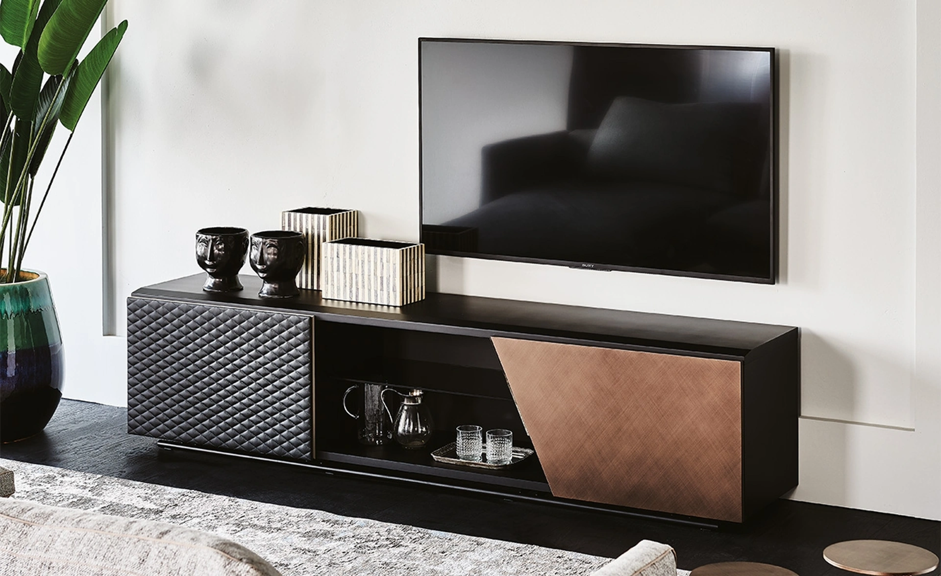 Il mobile porta TV Aston, firmato Cattelan Italia e concepito da STC Studio, rappresenta una soluzione d'arredo distintiva e versatile, pensata per completare con eleganza gli spazi living. Questo elemento si integra perfettamente con la collezione di credenze abbinate. La sua estetica è definita da un sapiente mix di materiali e finiture di alta qualità: la struttura portante in legno laccato goffrato nero (GF73) poggia su una solida base in acciaio goffrato nero (GFM73). L'anta laterale sinistra è sapientemente rivestita e trapuntata in ecopelle o pelle sintetica, impreziosita da profili in alluminio goffrato titanio (GFM11). L'anta destra offre flessibilità stilistica con opzioni in noce Canaletto (NC), rovere bruciato (RB) o l'esclusivo Brushed Bronze, arricchita da dettagli in cromo nero (06). All'interno, ripiani in vetro fumé e una sezione centrale a giorno sono ideali per l'organizzazione e l'esposizione di oggetti. Questa meticolosa progettazione assicura un'eccellenza costruttiva, garantendo un mobile durevole che conserva intatte le sue prestazioni e il suo appeal estetico nel tempo.