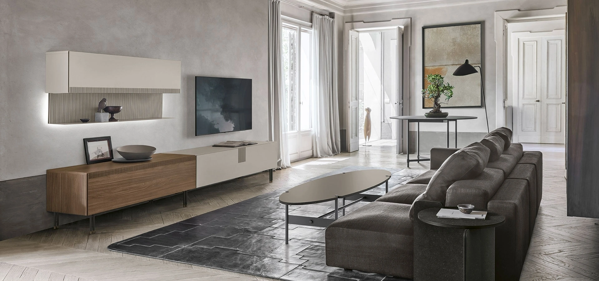 Il sistema porta TV TIME UNIT TI 105 di Tomasella incarna un'estetica raffinata e una funzionalità avanzata, caratterizzato da superfici con un distintivo effetto cannettato. Questa lavorazione arricchisce ogni elemento – dal pensile alla mensola, fino alla base – conferendo al mobile un'identità visiva unica. Progettato per elevare l'ambiente living, il design crea un punto focale di stile. Le opzioni di finitura, come il CDF noce ambra e il CDF madreperla, si combinano con la boiserie canetté e il laccato opaco madreperla 124, completate da un robusto basamento TRACKS, offrendo soluzioni estetiche e strutturali di alto livello. Per un'integrazione ottimale nel vostro progetto d'arredo, sono disponibili specifiche tecniche approfondite e schemi di configurazione modulare.