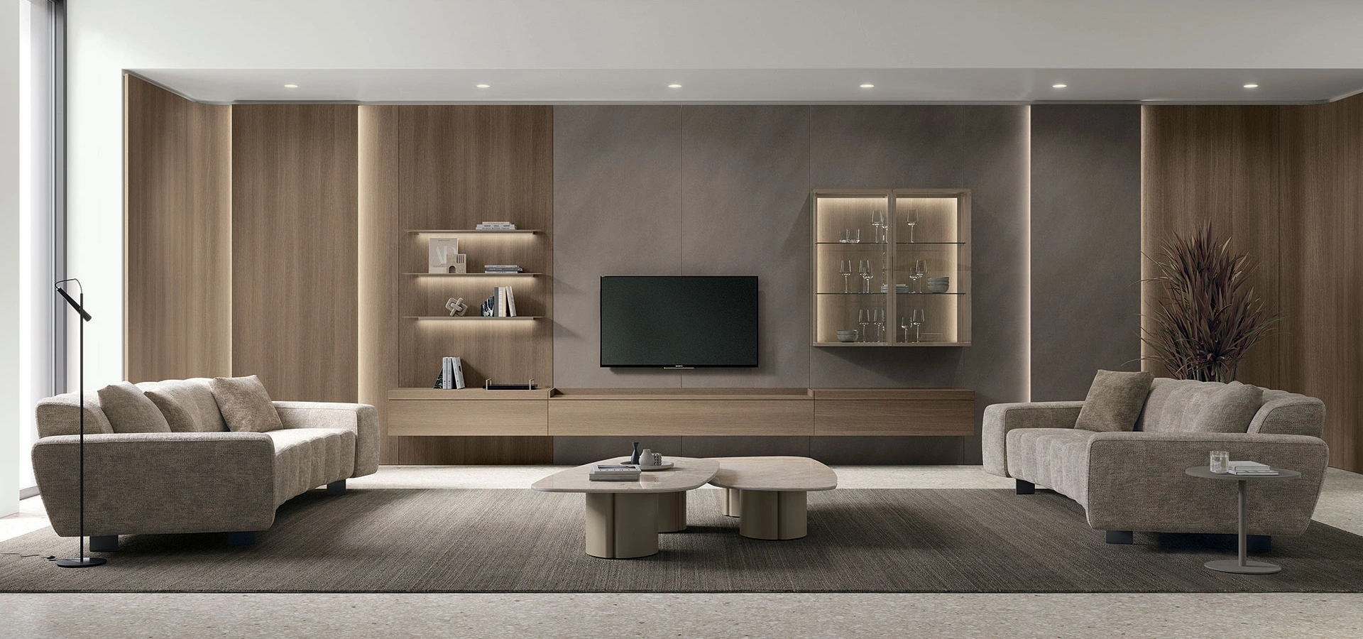 Quali sono i vantaggi distintivi della parete attrezzata Atlante UNIT AT144 per la zona giorno?Questa parete attrezzata si distingue per la sua modularità e la possibilità di integrare vani TV, mensole e ante di vario tipo. È ideale per creare soluzioni funzionali ed esteticamente curate, adattandosi a diversi stili di arredamento.