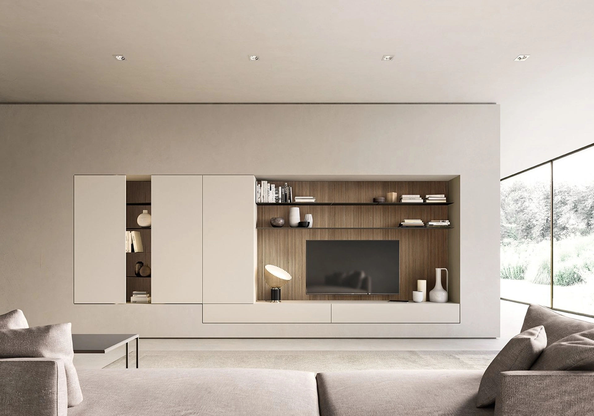 Quali opzioni di composizione offre la parete attrezzata Day Collection 02?La Day Collection 02 di Alf Da Frè presenta una composizione modulare con basi, pensili e colonne. Include anche moduli TV con passacavi, mensole a giorno e ante con diverse aperture come battenti, ribalta o push-pull.