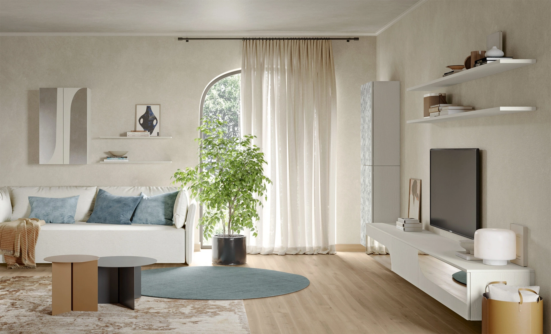 Quali elementi compositivi caratterizzano la parete attrezzata Eclettica EG004?La collezione Eclettica EG004 di Colombini Casa si distingue per la sua modularità, offrendo una vasta gamma di basi, pensili, colonne, moduli TV e mensole a giorno. È possibile creare configurazioni uniche con diverse ante e finiture per adattarsi al tuo spazio.