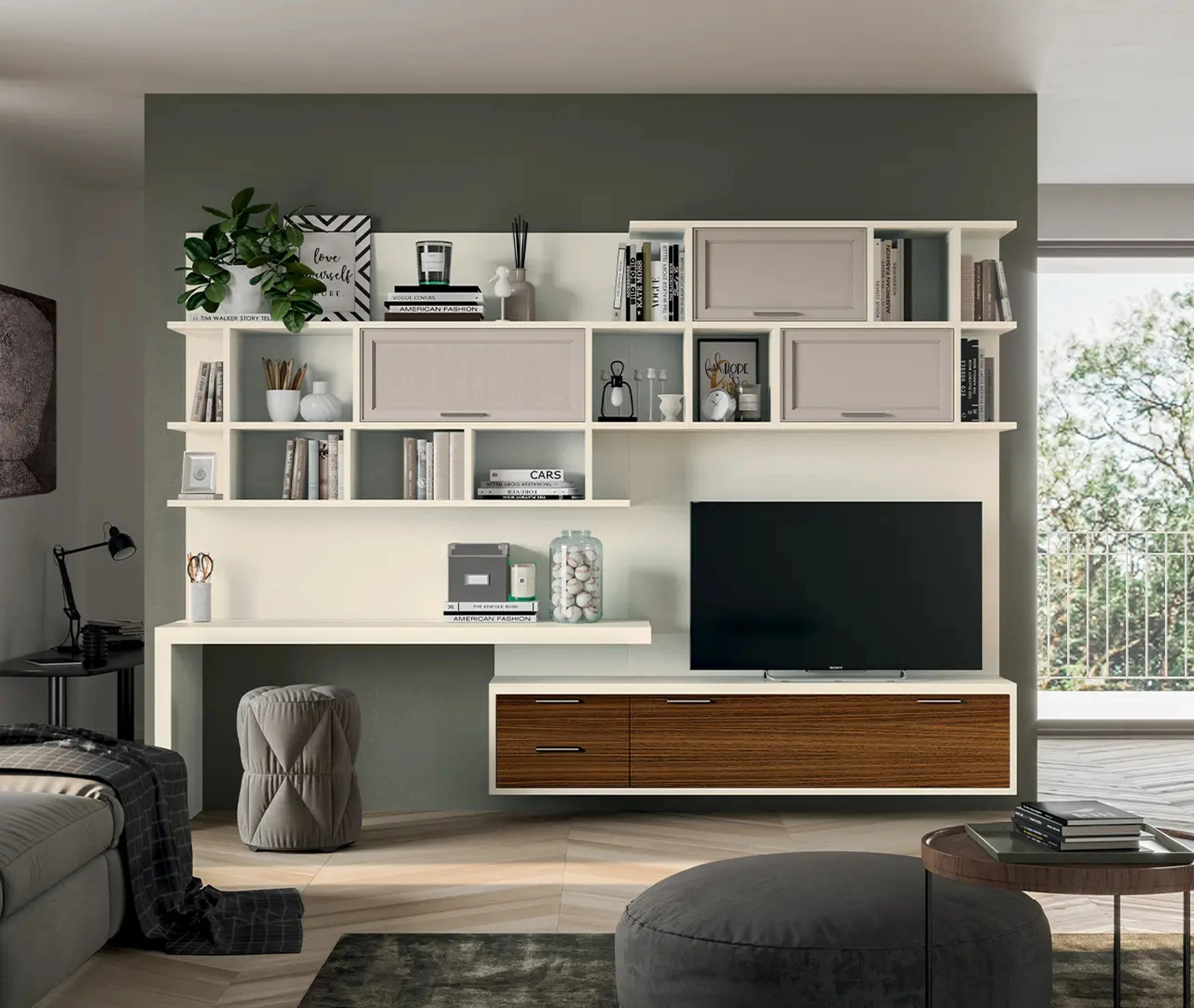 Un po’ librerie, un po’ mobili contenitori ed espositori: le Pareti Attrezzate sono ideali per attrezzare uno spazio operativo e pratico. La Parete Attrezzata Melograno composizione 87 di Le Fablier nell'immagine, realizzata in legno, risolve le più particolari problematiche abitative di spazio e stile senza rinunciare alla ricerca stilistica. Anche in un living non troppo grande, questo tipo di arredo riesce a organizzare al meglio gli spazi ottimizzando ogni angolo e garantendo l'alta componibilità tipica delle soluzioni moderne. Questa proposta costituisce tutta l'eccellenza che il brand assicura grazie a pluriennale professionalità e grande dedizione nel campo dell'arredo e del design.