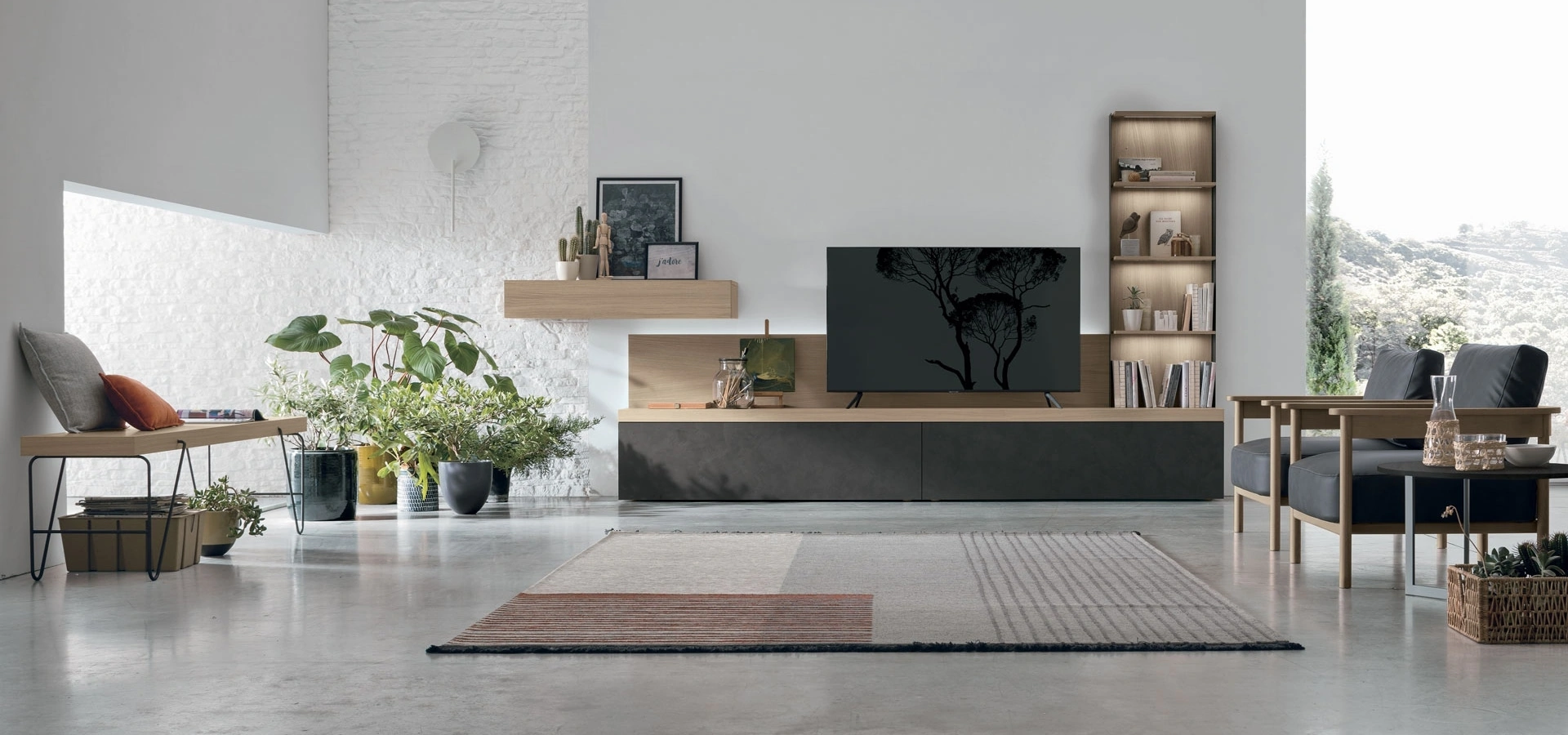 Quali opzioni di composizione e modularità offre la parete attrezzata Atlante UNIT AT117?Questa parete attrezzata di Tomasella è altamente modulare, con basi, pensili, colonne e moduli TV. Include mensole a giorno e ante con diverse aperture, permettendo configurazioni personalizzate per ogni ambiente.