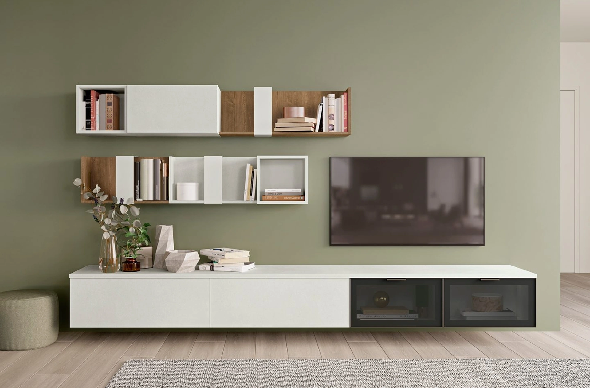 La parete attrezzata Volo L009 integra soluzioni per l'illuminazione o i moduli TV?Sì, il modello Volo L009 può includere illuminazione LED integrata e moduli TV con dimensioni adeguate e passacavi, per una perfetta integrazione estetica e funzionale.