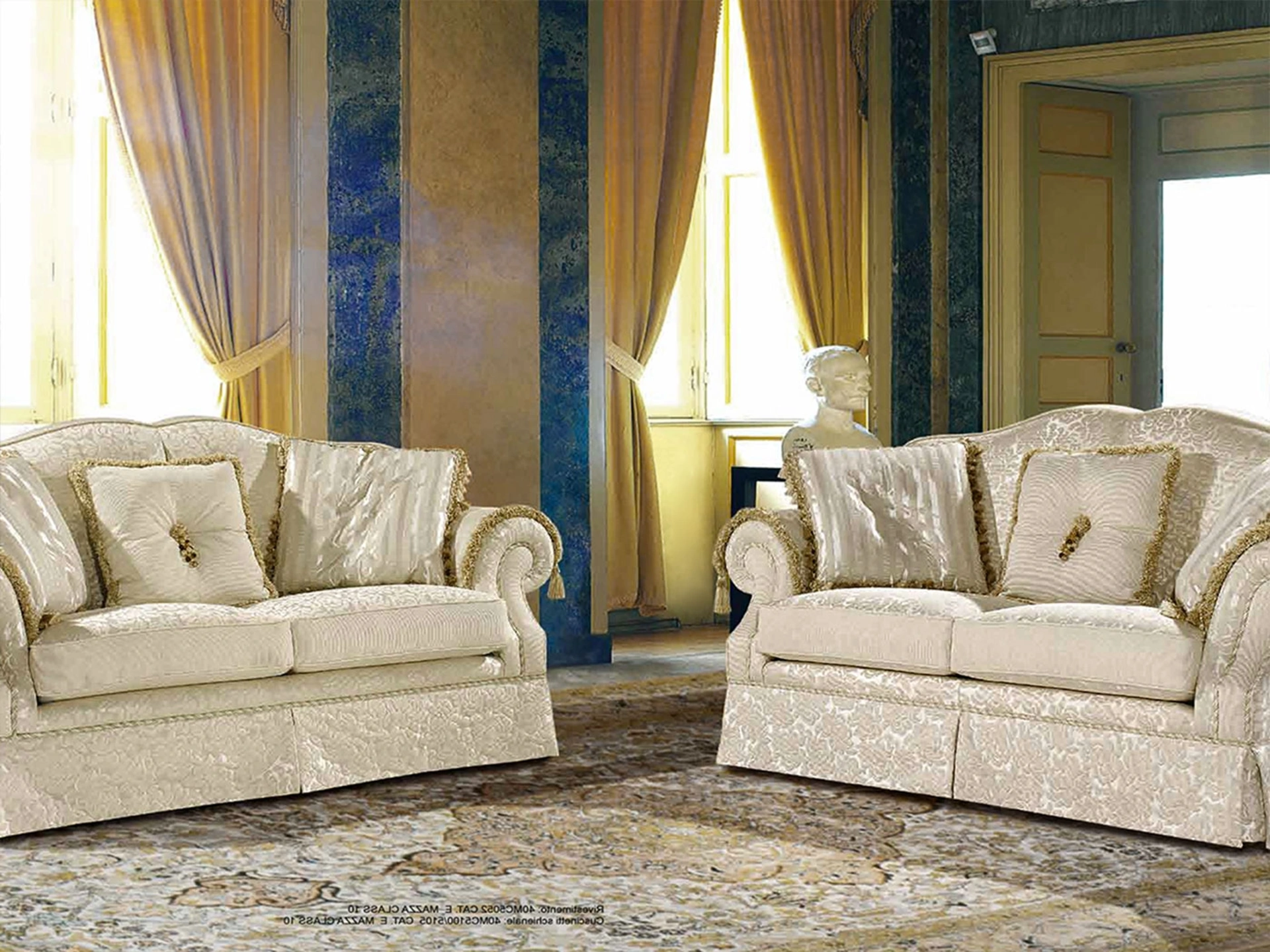 | Dettagli: | Profili con cordone di passamaneria su biscotto braccio, balza di serie, cuscinetti e copri braccioli di serie |