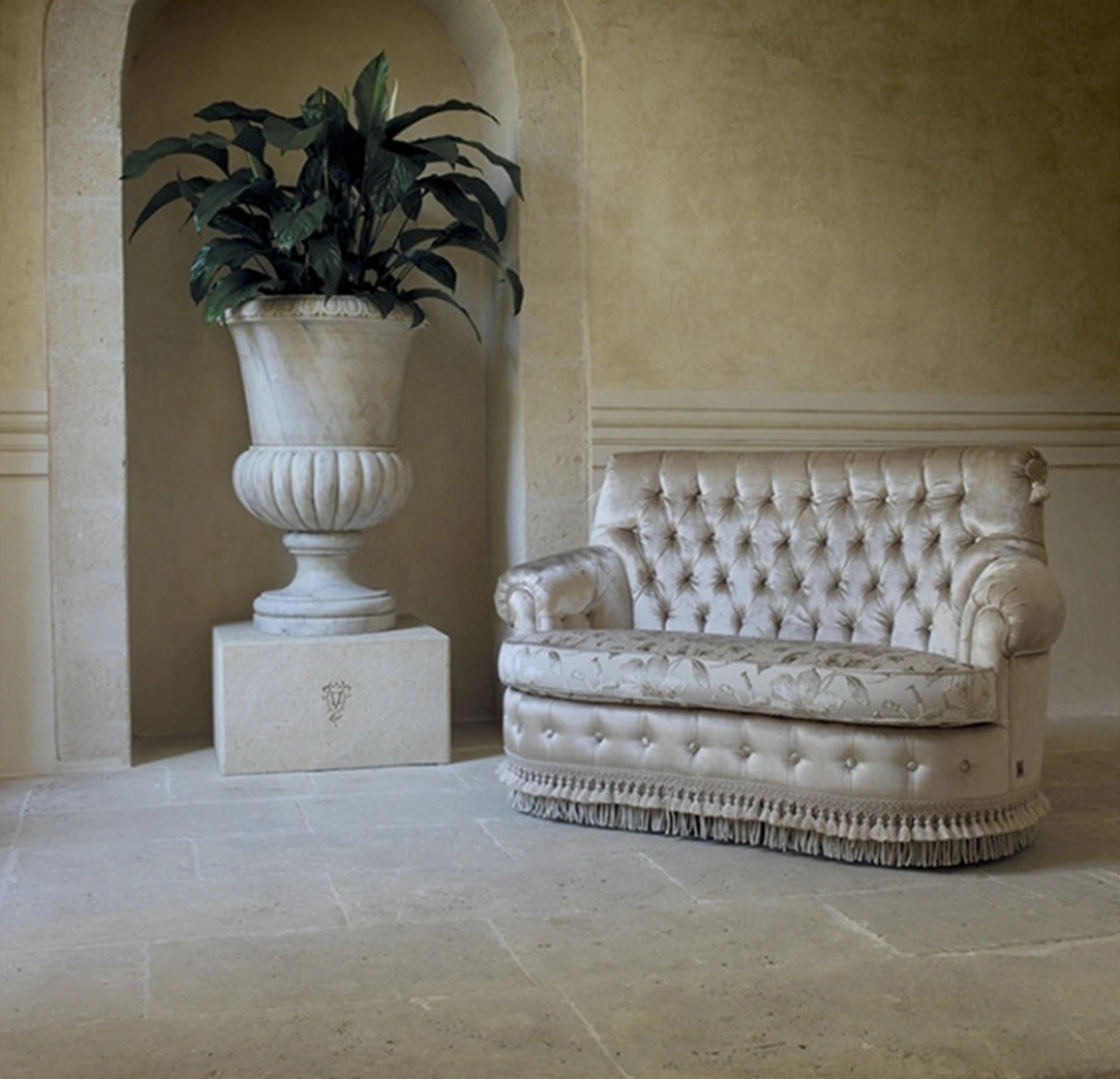 Il divano Saba, espressione del design TreCi Salotti, è progettato per offrire un'esperienza di comfort elevata nella sua configurazione a 2 posti. La solidità strutturale è garantita da un telaio in legno e derivati, arricchito da un sistema di cinghie elastiche incrociate ad alta resilienza. Per chi desidera un supporto ancora più specifico, è possibile richiedere l'integrazione di molle elicoidali nel basamento della seduta. L'imbottitura interna impiega poliuretano espanso con densità e quote differenziate, combinato a fibre poliestere, per un'ergonomia personalizzabile. Le opzioni estetiche includono una finitura con frangia o, in alternativa, una balza plissé, offrendo versatilità stilistica. La flessibilità di configurazione e la varietà di finiture consentono un'integrazione armonica in ogni contesto d'arredo, supportando scelte di design personalizzate.