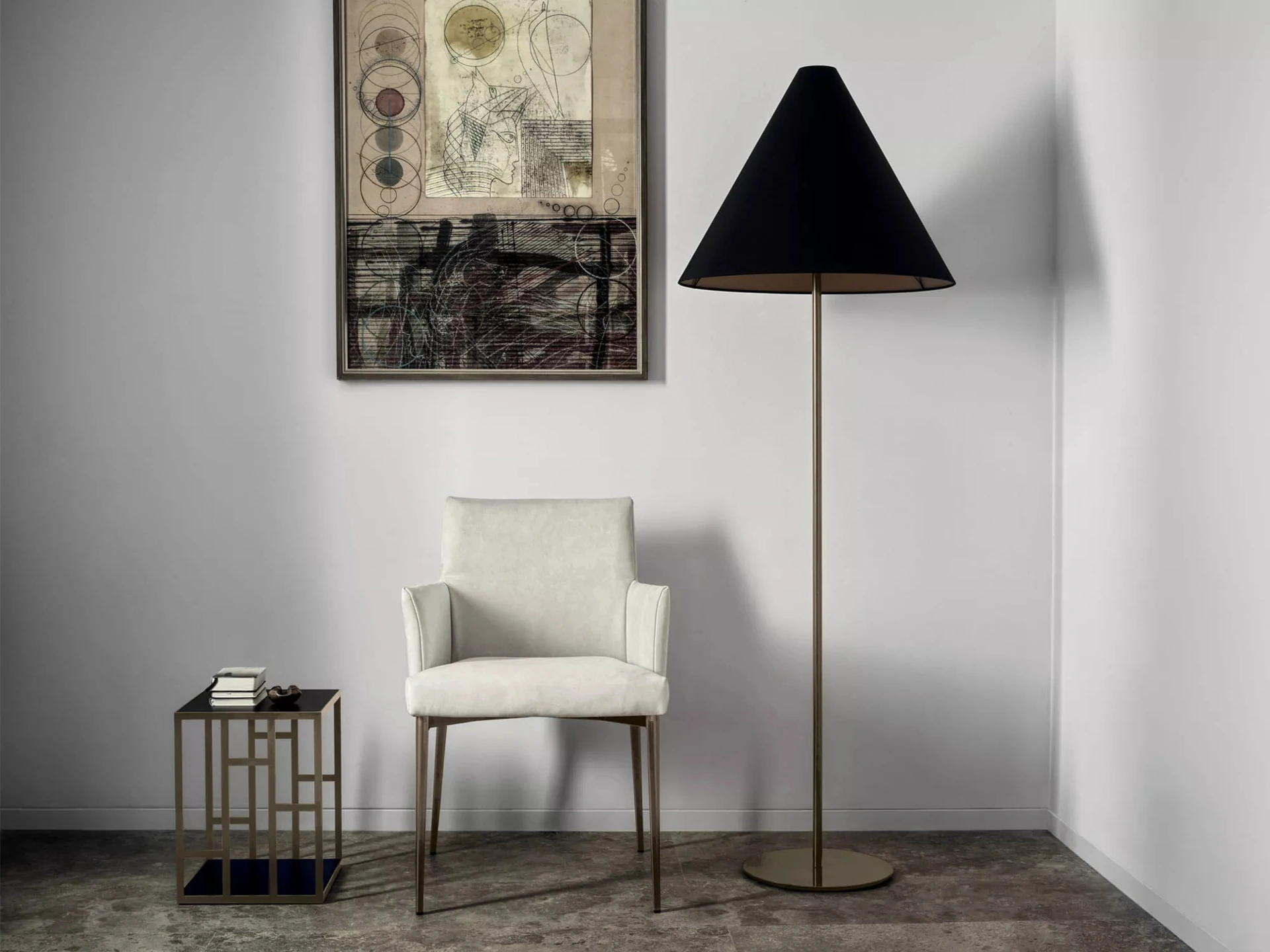 | Finiture: | Disponibile in diverse finiture di metallo laccato (es. Antracite, Argento naturale, Bianco, Nero, Oro, Ottone anticato) e rivestimenti in vari materiali come Pelle Prestige (es. Sabbia, Neve, Fango), tessuti (es. Gourmet, Nabuk vegano, Velluto Supreme) e ecopelle. |