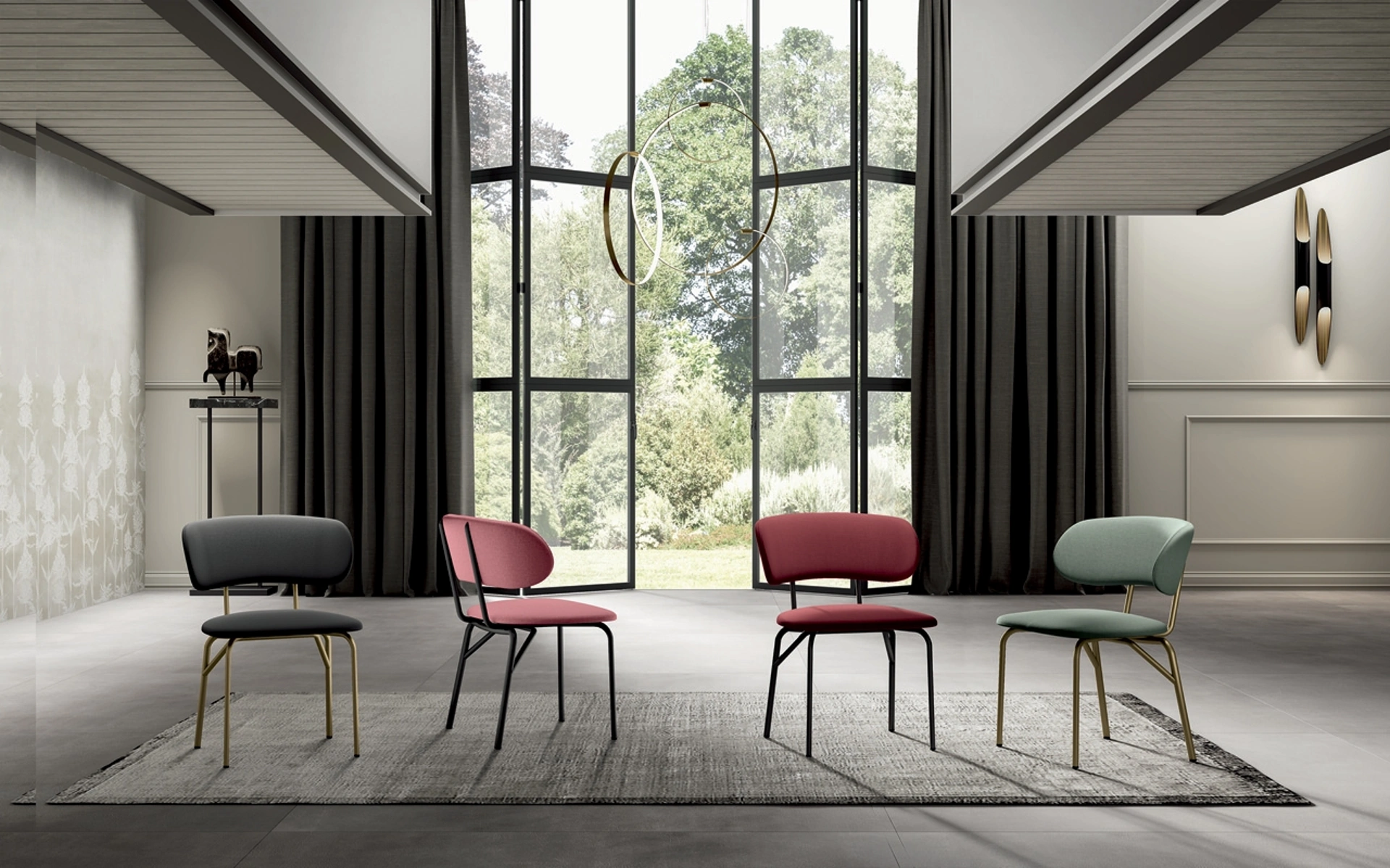 | Materiale: | Struttura in metallo verniciato, seduta e schienale in multistrato rivestito con diversi materiali e colori di finitura. |