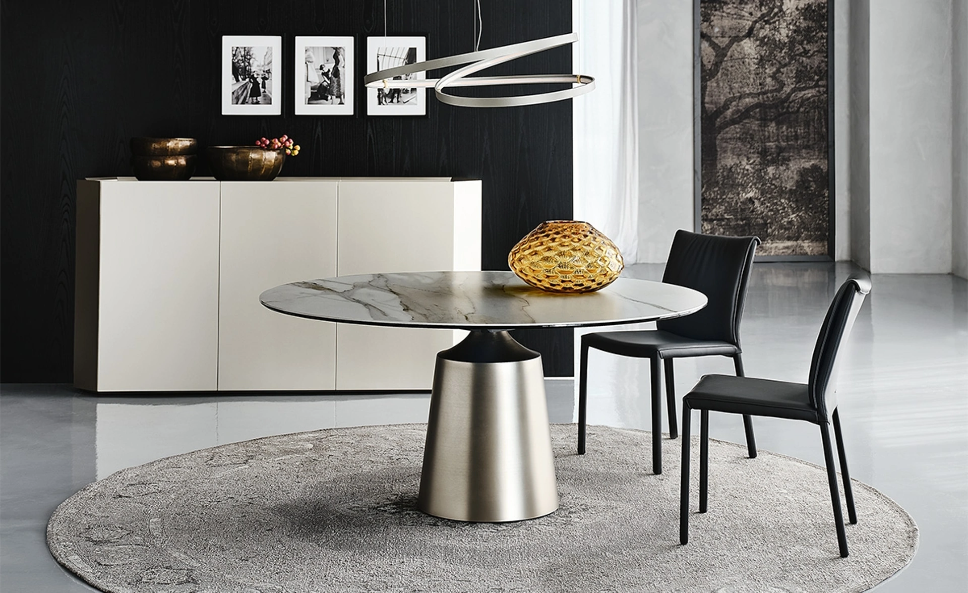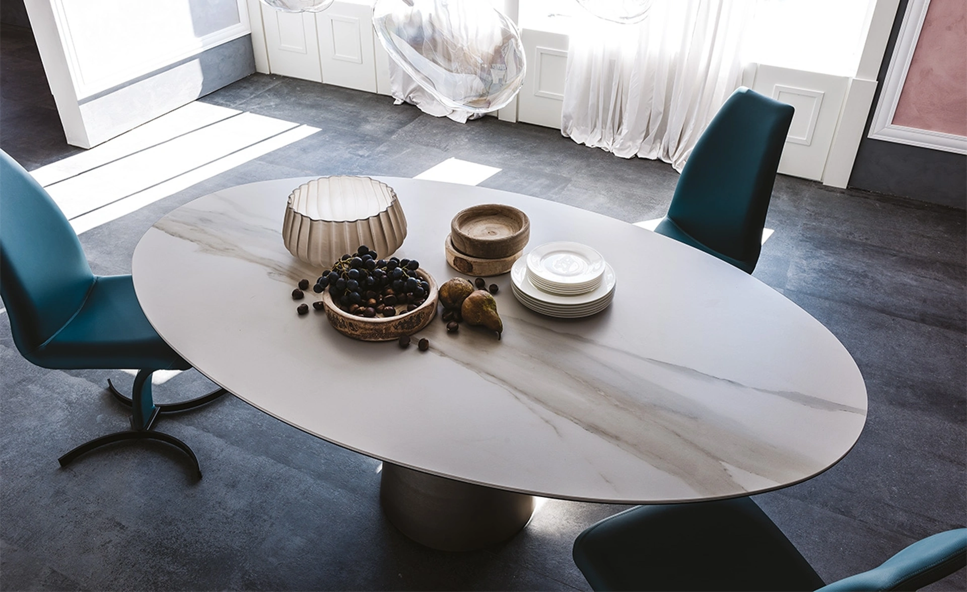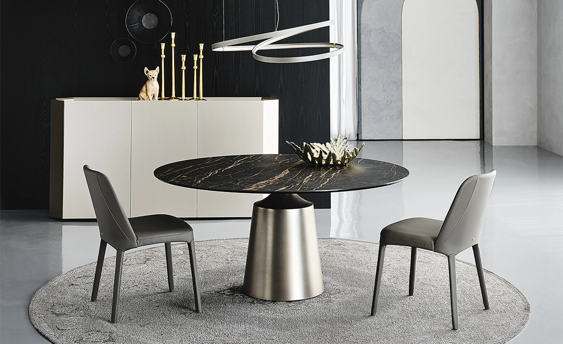 Il tavolo Yoda Keramik di Cattelan Italia rappresenta una soluzione d'arredo sofisticata per la zona pranzo, distinguendosi per la sua configurazione versatile, disponibile in formati rotondi o ovali. Il piano è realizzato in pregiata ceramica, offerta in una vasta gamma di finiture esclusive come Marmi Alabastro, Calacatta Oro e Portoro, garantendo elevata resistenza all'usura e facilità di manutenzione. La struttura portante, un elegante tronco di cono centrale, è forgiata in acciaio con diverse opzioni di laccatura goffrata (bronzo, grafite, perla, nero) o in acciaio satinato titanio, conferendo stabilità e un'estetica contemporanea. Questo modello fa parte della rinomata collezione Yoda, che esplora l'utilizzo di materiali nobili. La funzionalità è ulteriormente ampliata dalla possibilità di integrare un vassoio girevole centrale Lazy Susan, ottimizzando l'esperienza d'uso. L'attenta selezione dei materiali e la cura nella realizzazione ne fanno un elemento d'arredo di pregio, progettato per garantire longevità e mantenere inalterata la sua bellezza estetica nel corso degli anni.