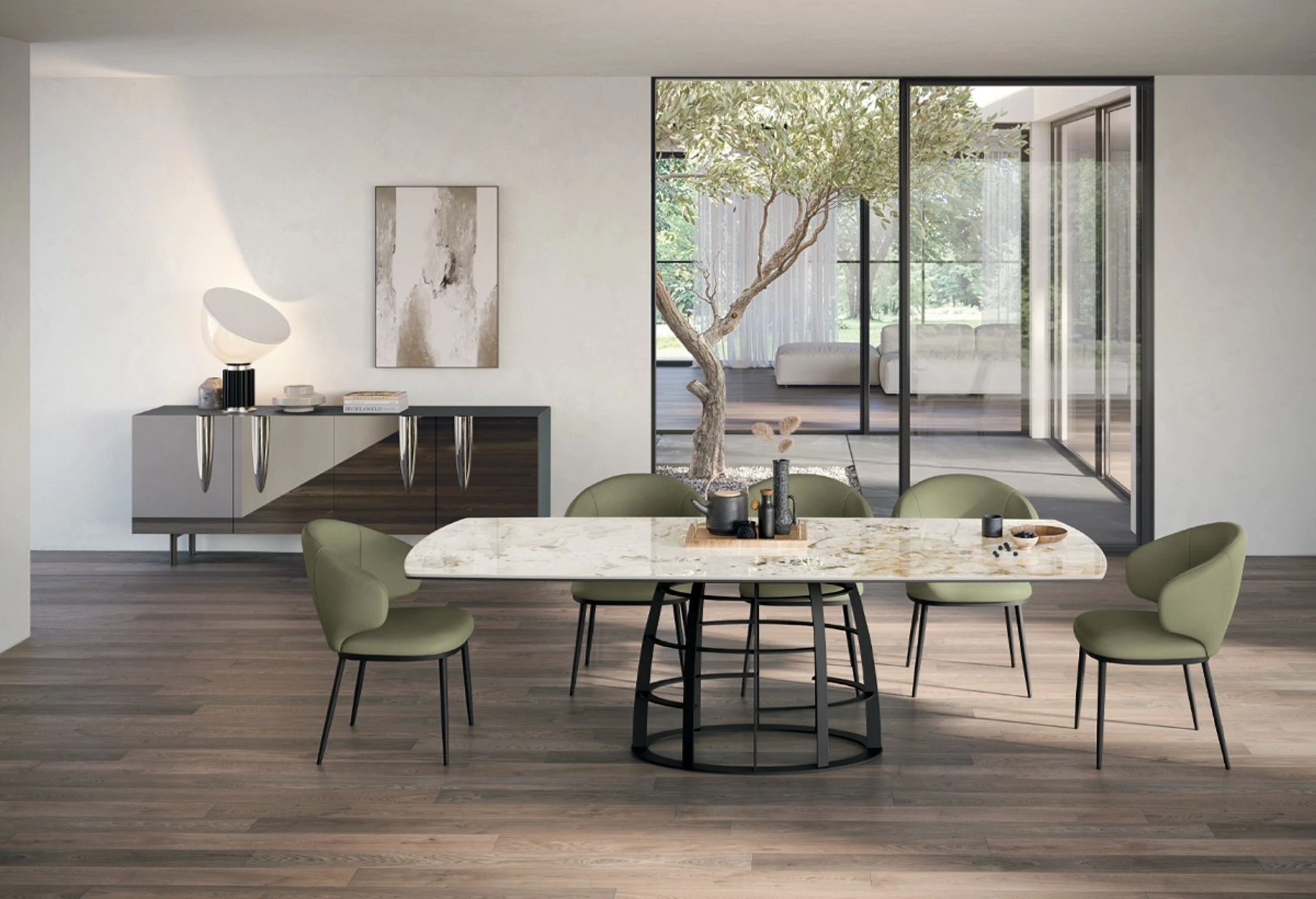 Il tavolo Cosmos, firmato Target Point, si distingue per un design caratterizzato da un robusto basamento in metallo, elemento che ne esalta la personalità e la stabilità. Questo modello versatile è proposto sia in configurazione fissa con un elegante piano ovale, sia in versione allungabile. Quest'ultima integra un avanzato sistema girevole semiautomatico che consente di estendere la superficie da 160 cm fino a 240 cm, accomodando comodamente fino a dieci commensali. La struttura portante è interamente realizzata in metallo, mentre il piano è disponibile in diverse pregiate finiture: grès, offerto sia in versione opaca che lucida, o vetro con stampa digitale, garantendo un'elevata resistenza e facilità di manutenzione. Per una comprensione approfondita delle specifiche tecniche, delle varianti di materiale e delle opzioni di personalizzazione, si invita a consultare la documentazione dettagliata del prodotto.