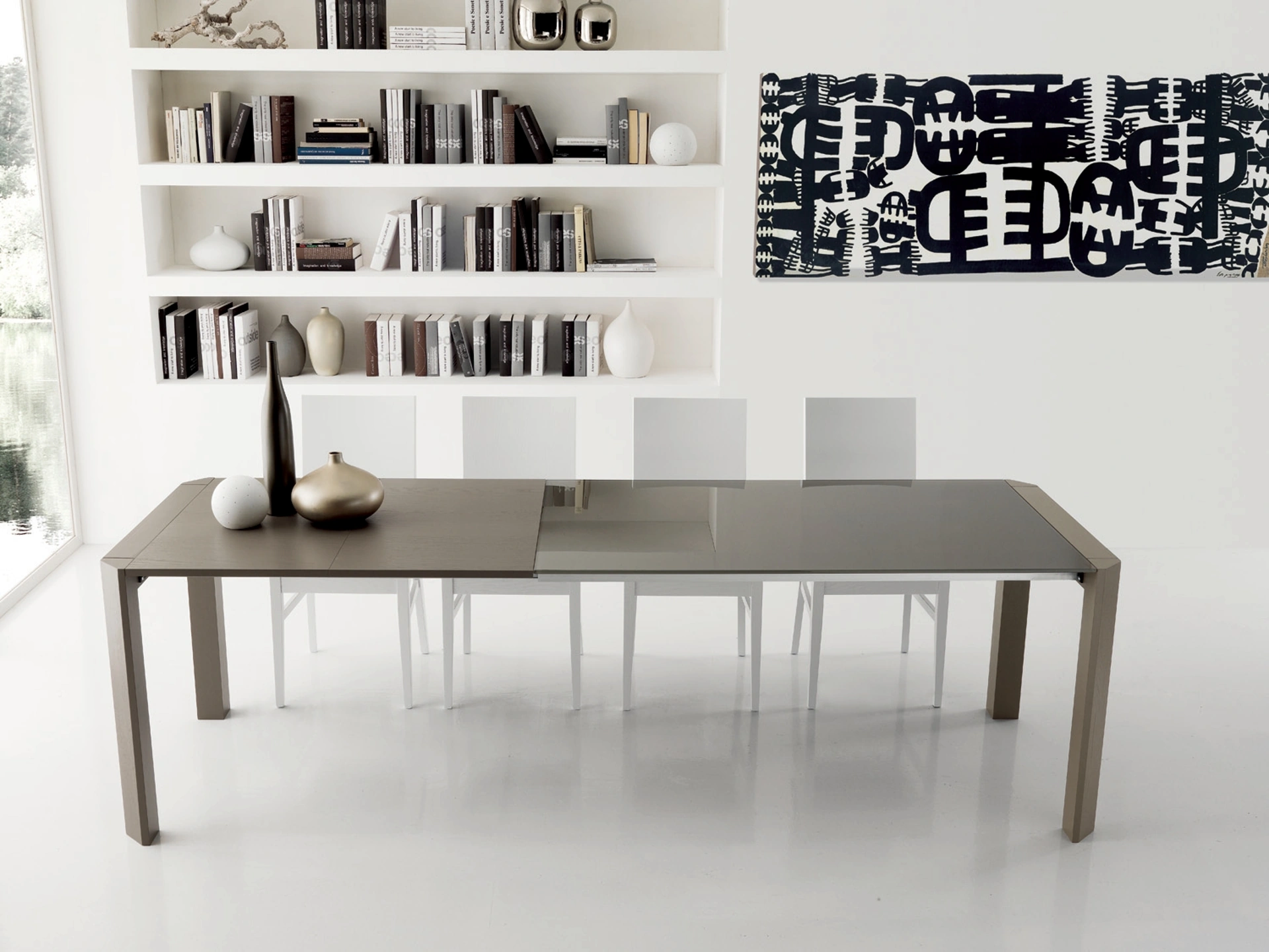 | Materiali: | Ponte gamba in Frassino massiccio, sistema di allungo in Alluminio anodizzato, piano in vetro temperato (10 mm), laminato o impiallacciato in Frassino (20 mm). |