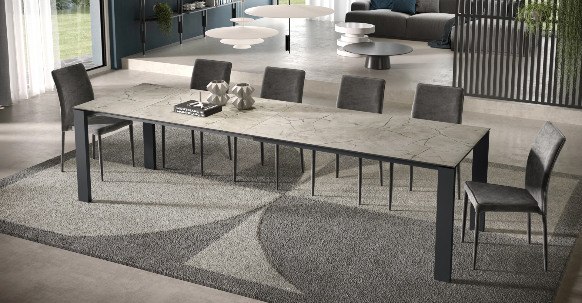 | Materiali: | Piano in Nobilitato, Laminato, Vetro-Ceramica o Rovere (anche versione Rovere Spaccato); Gambe in metallo; Sistema di allungo in Alluminio anodizzato. |