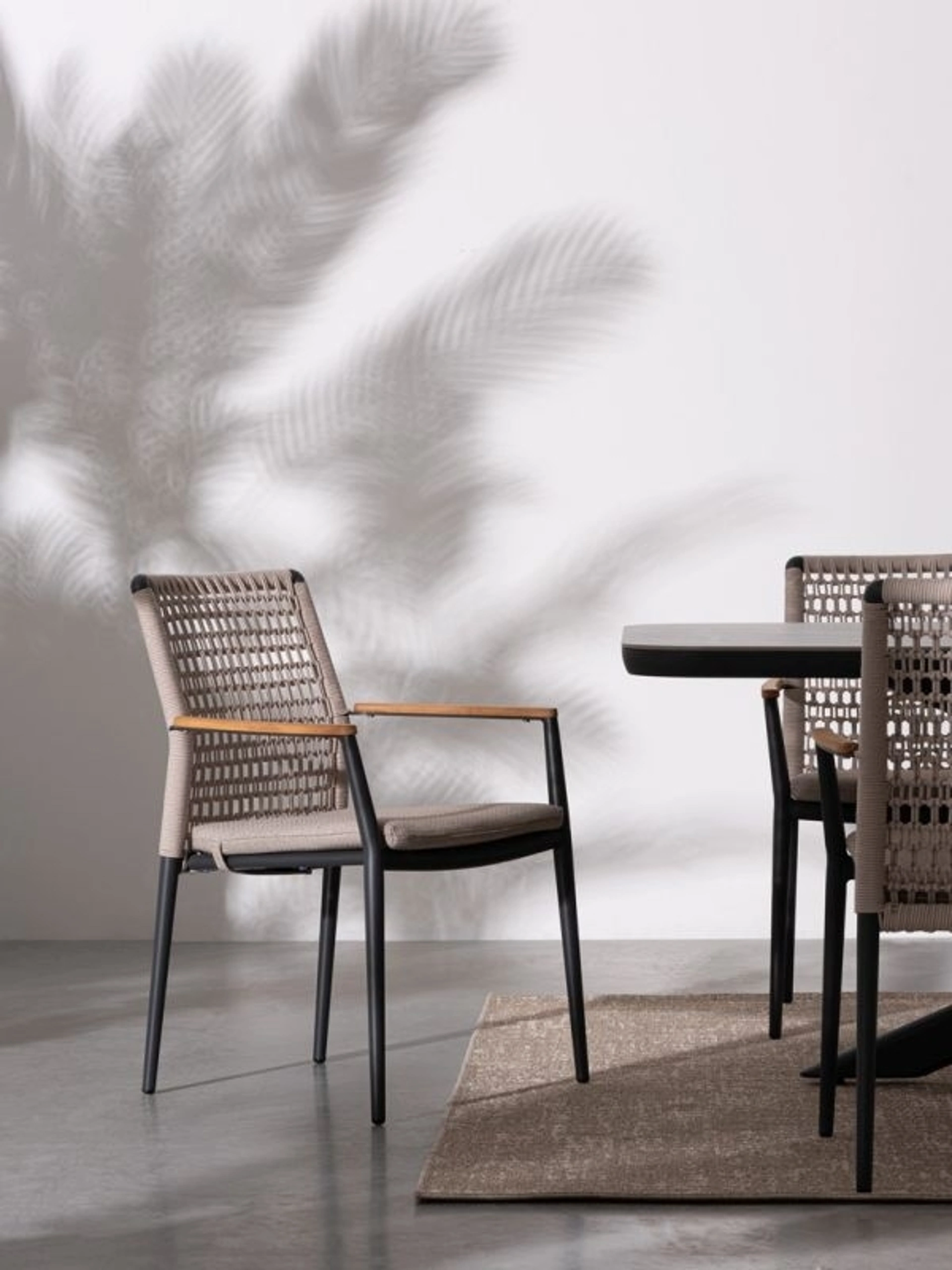 La poltroncina da esterno Maddox, firmata Bizzotto, si distingue per la sua robusta struttura in alluminio verniciato a polvere con finitura poliestere, garantendo un'elevata resistenza agli agenti atmosferici. I braccioli sono impreziositi da eleganti inserti in legno teak, che aggiungono un tocco naturale e raffinato. L'intreccio, realizzato in corda olefin, si combina con un cuscino sfoderabile in tessuto olefin idrorepellente (100% polipropilene), rendendo la sedia ideale per un utilizzo prolungato in ambienti esterni. Un'ulteriore caratteristica funzionale è la sua capacità di essere impilabile, ottimizzando lo spazio quando non in uso. Questo prodotto è progettato per offrire affidabilità e prestazioni durature, con una costruzione che ne assicura la longevità.