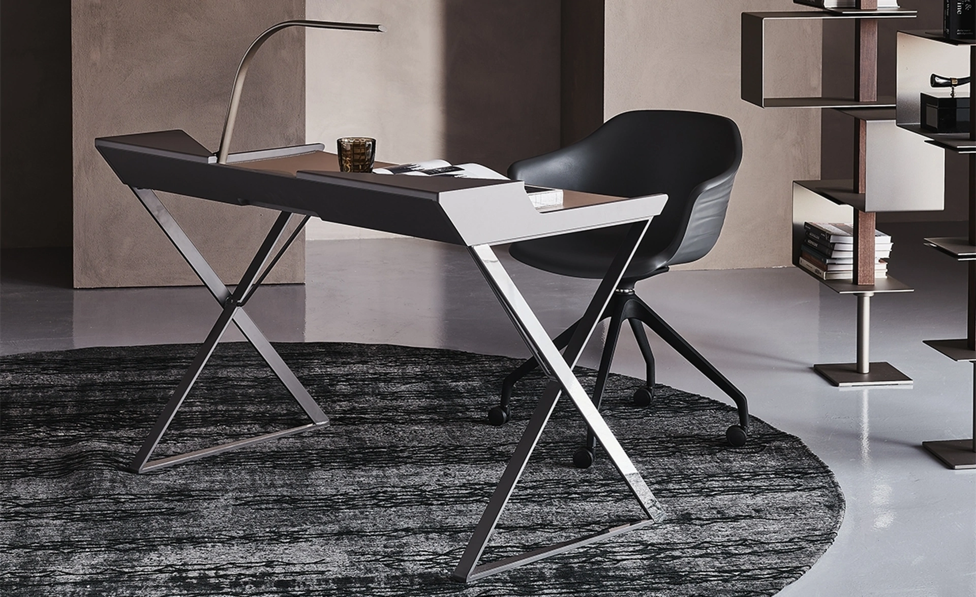 | Materiale: | Telaio in acciaio verniciato opaco (graphite OP69 o bianco OP71) con profili in acciaio inox lucidato. Piano in MDF laccato goffrato (graphite GF69 o bianco GF71). Pad in cuoio (colori da campionario). |